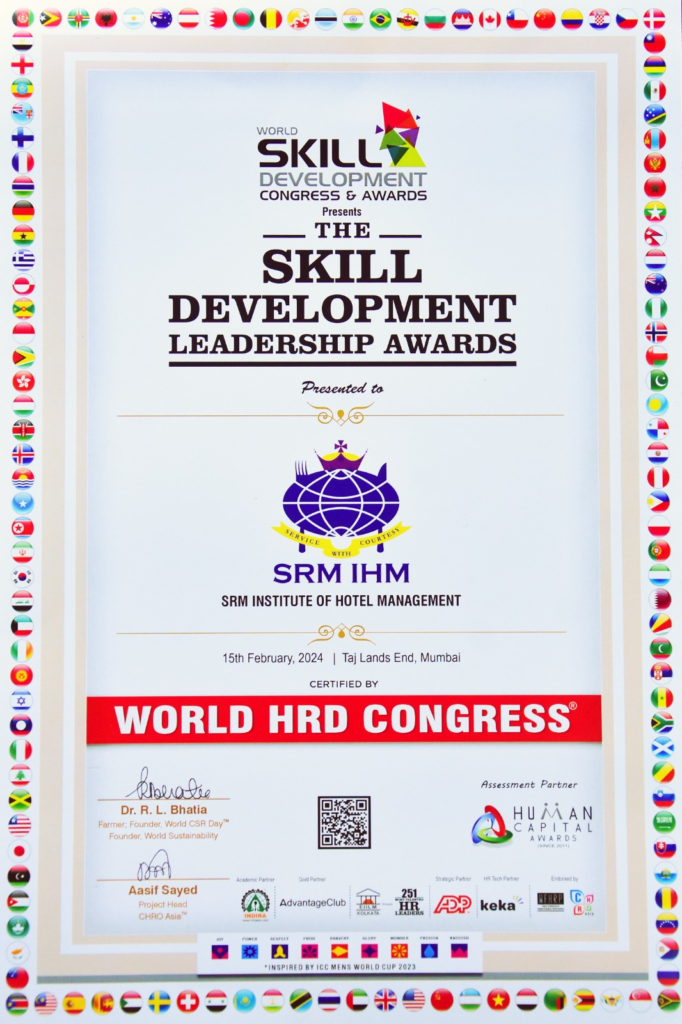 World Skill Development Congress and Awards presented the Skill Development Awards to SRM Institute of Hotel Management on 15th February 2024 at Taj Lands End, Mumbai. The skills that the institute has brought out are worthy to be mentioned. Carving, baking, hotel reception, cooking, floral arrangement, bar tending, photography, plate presentation and much more are the skills that have been identified.